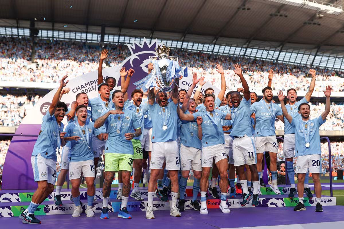 Manchester City won an unprecedented fourth consecutive English top flight title with a 3-1 victory over West Ham United on Sunday, defeating rivals Arsenal on the final day of a thrilling Premier League season as fans turned the pitch into a sea of blue.