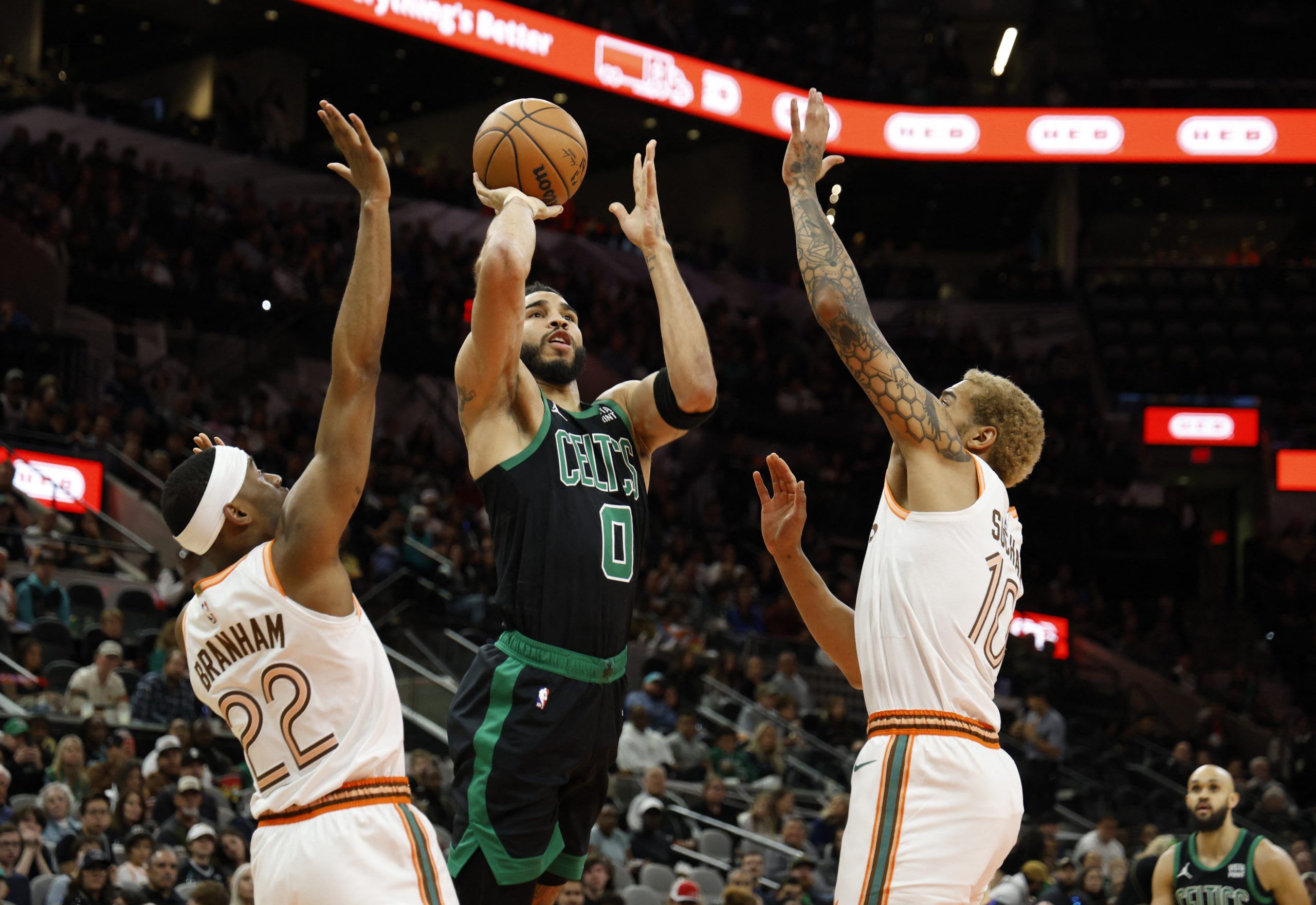 The Celtics clinched a victory against the Spurs with Jayson Tatum's impressive 10-of-17 shooting, while Derrick White, amidst cheers from Texas fans, contributed 17 points.