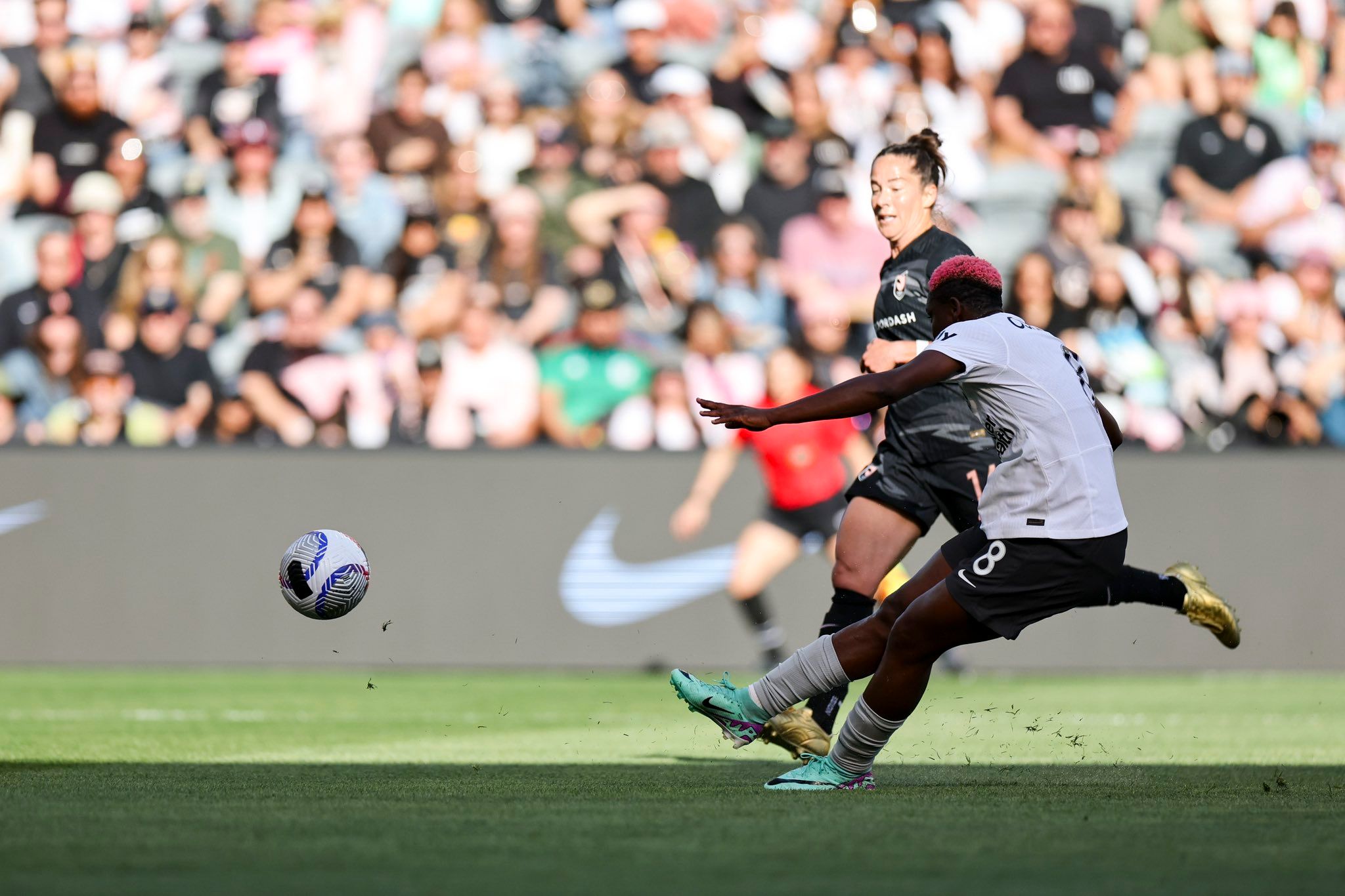 In the 17th minute, Bay FC's Tess Boade intercepted a pass upfield and found Oshoala in the box. Oshoala found the upper right corner with her first time strike.