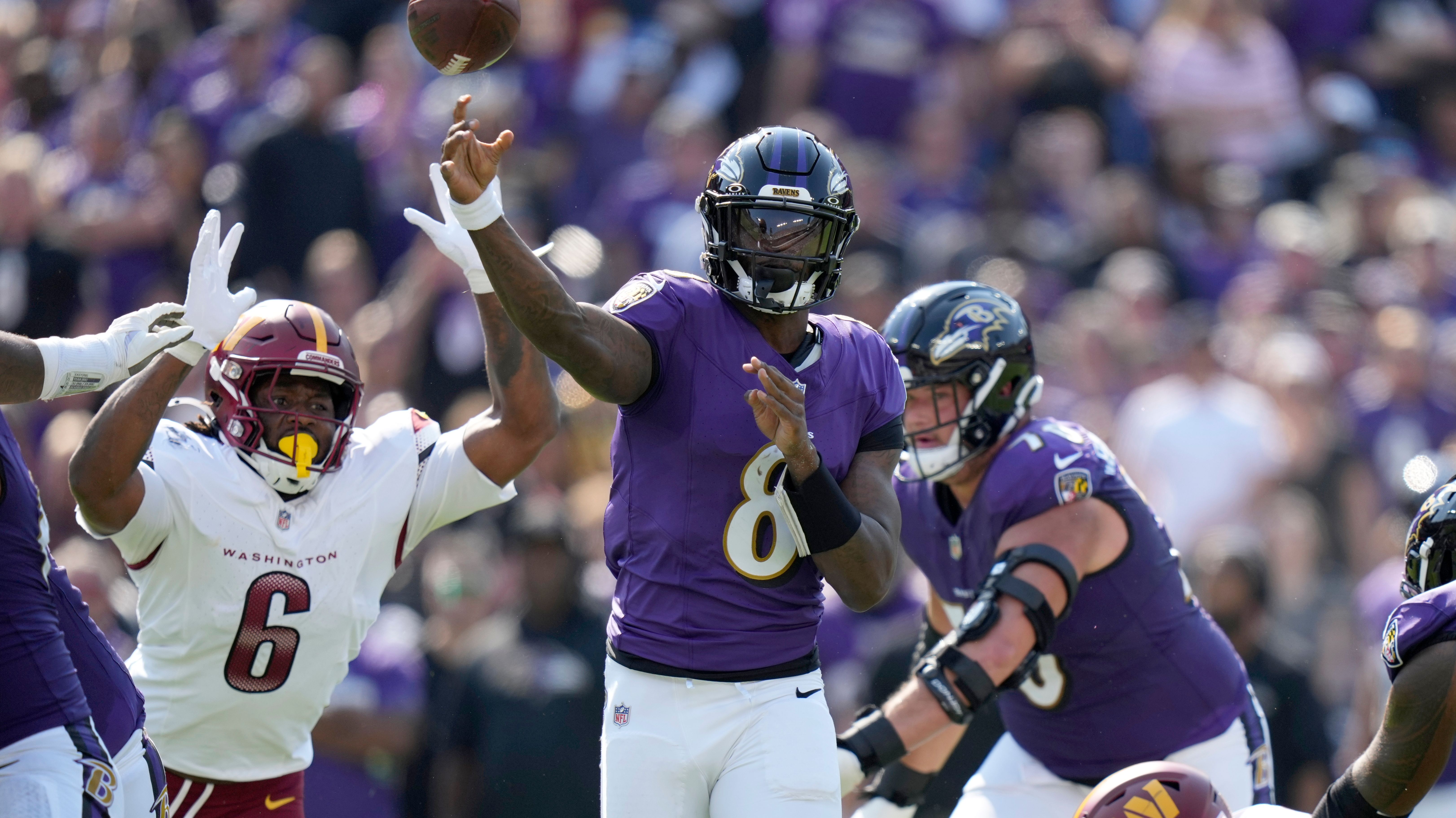 Lamar Jackson, aged 27, passed for 323 yards and a touchdown, leading the Baltimore Ravens to a 30-23 victory over the Washington Commanders on Sunday in a clash between the NFL's highest-scoring teams.